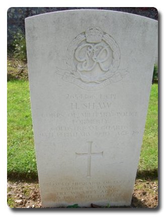 | Notes: | CMP. 6/1/1930 he enlisted in the Coldstream Guards at Sheffield in the Regular Army for 3/9 years, born 25/7/1910 at Wombwell, Barnsley, occupation miner, 2/1/1940 compulsory transfer to CMP. 9/2/40 Died. He was born in Yorkshire and resided in Sheffield. Inscription on gravestone: Beloved husband of Becky, father of David, till we meet again, to die is but to sleep. Casualty Lists 124/1, BEF, France, dangerously ill, 9/2/40, shown as Dock Police Group. Casualty List 125/1, BEF, Died result of accident, Dock Police Group, 9/2/40. 11/4/49 he was awarded the War Medal. note:- 3 Company, 3 Coldstream Guards. Le Havre Dock Area. Harry Shaw. |