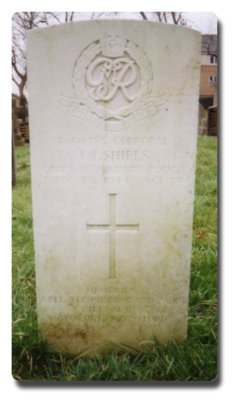 | Notes: | CMP. Enlisted in the Coldstream Guards and later transferred to CMP.. He was born and resided in Leeds. War Diary WO 171/3410, 71 Section SIB. 12/5/44 No.2654785 P/A/Cpl. Shiels J J was involved in an accident when riding a WD motorcycle. He struck a WD 3 ton lorry. He was conveyed to Southend General Hospital, when it was revealed that he was very serious injured. His wife and parents were sent for and arrived next day. The section was further aggravated by the sad death of Cpl Shiels and the resultant work. 23/5/44 Cpl Shield J J died this day at Southend General hospital, as a result of injuries received on 12/5/44. Next of kin were in attendance and claimed the body to take back to Leeds. 25/5/44 Attended inquest into Shiels death - accidental. This section acted as bearers of the body of Cpl Shiels when he was put on a train for burial at Leeds. It was very gratifying to learn from the Padre that he had been informed by the hospital that they had never before know a group of soldiers show such concern over a comrade as was shown by my Section for Shield before he died. Casualty List 1460/11, Home, Died as a result of accident, 23/5/1944. 7/9/49 He was awarded the Defence Medal, War Medal. Address:- 12a Lupton House, Quarry Hill Flats, Leeds 9, Yorks Inscription on gravestone: Memories of a beloved husband and daddy, eternal rest give unto him O'Lord. John Joseph Shiels. |