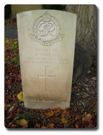 | Notes: | CMP. He was born in Worcestershire and resided in Birmingham and formerly served in the Worcestershire Regiment. Inscription on gravestone: Greater love hath no man tan he lays down his life for his loved ones. Casualty List 1295/13, Home, Accidentally killed, 9/11/43. 7/9/49 He was awarded the 1939-1945 Star, Defence Medal, War Medal. Address:- Mrs E M Spread (correct name Shread), 61 Reeves Street, Bloxwich, Nr Walsall, Staffs. Joseph Shread. |