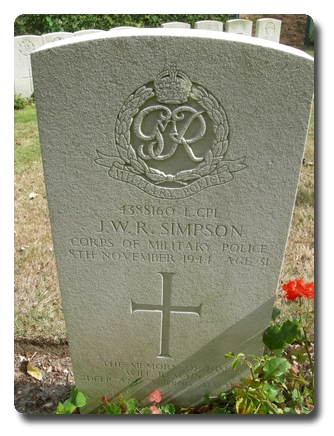 | Notes: | CMP. He was born and resided in Middlesbrough and formerly served in the Green Howards, 245 Pro Coy War Diary, WO 171/3390. 7/11/1944 St Omer, L/Cpl Simpson J W R 4388160 involved in a traffic accident with a French civilian car. 8/11/1944 L/Cpl Simpson died, 9/11/1944 L/Cpl Simpson buried. Casualty List 1615/25, Western Europe Died Result of Accident, 8/11/1944. Medal card not found. Inscription on gravestone: The memory of him will remain deep and abiding always. John William Richard Simpson. |
