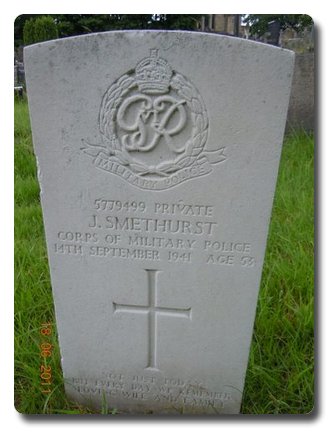 | Notes: | CMP. VP. Enlisted in the Royal Norfolk Regiment, 20/5/41 transferred to CMP. 14/9/41 Died. He was born and resided in Manchester. Born 1/8/1891. 14/9/1941, Died, Home. Inscription on gravestone: Not just today but every day we remember, Loving Wife and Family. His son John Worsley Smethurst, 851232 Gunner, 1 Field Regiment, Royal Artillery was killed on 14/9/40, age 31 years. He is buried at El Alamein War Cemetery, Egypt in plot XII. C. 16. Casualty List 659, Home, Died result of accident, 14/9/41.7/9/49 He was awarded the War Medal. Address:- 24 Houghton Street, Pendlebury, Nr. Manchester, Lancs. John Smethurst. |
