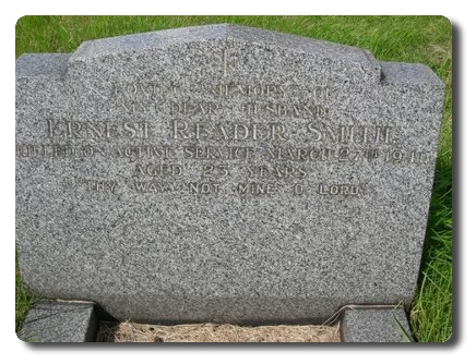 | Notes: | CMP 28 Company TC. 13/6/40 enlisted in the North Staffordshire Regiment, 25/1/41 transferred to CMP. 28 Coy (TC). 27/3/41 Died. He was born and resided in Nottingham. War Diary, "S" Group, Traffic Control. WO 166/5861. Abergavenny, 27/3/1941. 5053527 Pte. Smith E R killed in a traffic accident. 28 Coy (TC) part of "S" Group, Traffic Control. Casualty List 480/5. Home, Died as a result of an accident, 27/3/41. 7/9/49 He was awarded the Defence Medal, War Medal. Address:- not shown. Inscription on private gravestone: In loving memory of my dear husband Ernest Reader Smith, killed on active service March 27th, 41, Age 23. Thy way not mine O'Lord. Grave has a small stone vase marked: From Officers and men of 28 Coy (TC). Ernest Reader Smith. |