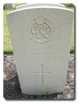 | Notes: | CMP. He was born and resided in Lancashire and formerly served in the Manchester Regiment. 247 Pro Coy War Diary WO 171/10801. 6/1/1946, Brussels, notification received at this HQ of the death of L/Cpl J Smith of this unit who died at 108 General Hospital. 7/1/1946 funeral of the late L/Cpl smith of this unit, friends given full opportunity to attend. Casualty List 1961/6, North West Europe, died as a result of an accident, 5/1/1946. 7/9/49 He was awarded the 1939-1945 Star, Africa Star with 1 army clasp, France & Germany Star, Defence Medal, War Medal. Address:- Mrs E Smith, 64 Warrington road, Glazebury, Nr. Manchester, Lancs. Inscription on gravestone: The day thou gaveth Lord is ended, the dawn leads to another day. James Smith |