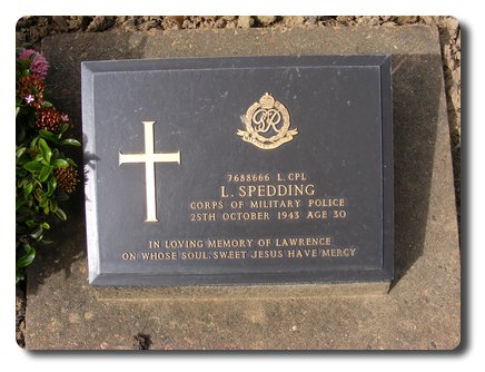 | Notes: | CMP. POW. He enlisted in to the CMP. He was born and resided in Harrogate, Yorkshire. 15/2/42 captured Singapore. Inscription on grave panel: In loving memory of Lawrence on whose soul sweet Jesus have mercy. Died Thailand 25/10/43, Cutts papers 26/7/44. Info from Japanese POW index card: Lawrence Spedding, 15/11/1911 born 18 Nydddale Terrace, Harrogate, address: wife Maud, 28 Dragon View, Harrogate, Occupation Cinema Foreman, father Charlie. He is listed on British POW's held in Japan and Japanese Occupied Territory: 47416, Spedding, Lawrence, L/Cpl, 7688666, Army, captured 15/2/1942, died 25/10/1943, camp MA, Malaya, deceased. He is listed on Malaya POW Camp Roll: Spedding, Lawrence, Army, L/Cpl, new POW No. 10027, old POW No. i/5852, 7688666, 25/10/? He is listed on British POW who died of illness or aerial bombardment: 23. L/Cpl, Lawrence Spedding, 7688666, died 25/10/1943 from Beri Beril. Casualty List 766/12, Malaya, missing, 15/2/1942. Casualty List 945/19, POW previously reported missing, previously shown on List 766 as missing 15/2/1942. Casualty List 1159/28, correction, List 945, Malaya, Now POW previously reported Missing on List 766, 15/2/1942. Casualty List 1659/21, POW, previously reported POW in Japanese hands now reported died, date of death 25/10/1943, previous List 945 corrected by 1159, Malaya. Medal card not found. Lawrence Spedding. |