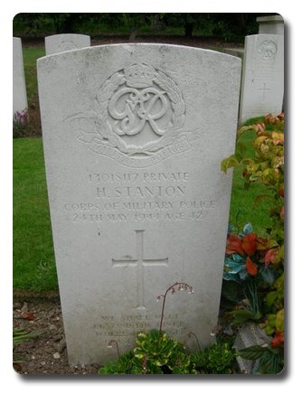 | Notes: | CMP. Formerly Pioneer Corps transferred to CMP. VP. He was born in London NW and resided in London N. Unit War Diary 335 Coy VP. CMP. WO 166/16256. 24/5/44 Southampton. Strength Decrease 1 OR (No. 13018117 Pte Stanton H died from self inflicted wounds, buried at Hollybrook Cemetery, Southampton on the 30/5/44. Casualty List 1465/28, Home, Died, 24/5/1944. 20/9/49 He was awarded the Defence Medal, War Medal. Address:- 31 Dickenson Street, Kentish town, London N W 5. Inscription on gravestone: We shall meet beyond the rivers, where the surges cease to roll. Harry Stanton. |