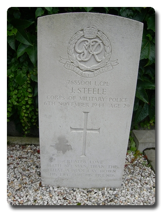 | Notes: | CMP. He was born in Walsall and resided in Birmingham and enlisted in to CMP. 7 Armd Div Pro Coy War Diary WO 171/454. 6/11/1944 L/Cpl J Steele killed on duty by explosion of 6 teller mines. Casualty List 1609/11, Western Europe, killed in action 6/11/44. Medal card not found. Inscription on gravestone: Greater love have no man than this, that a man lay down his life for his friends. John Steele. |