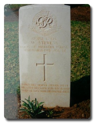 | Notes: | CMP. 114 Pro Coy. Enlisted in the East Surrey Regiment, transferred to CMP. 4/3/43 Died. He was born in Croydon and resided in Surrey. War Diary, 114 Pro Coy, WO 169/13257. 3/3/43 disturbance at Greek refugee camp, CMP personnel fired upon by Greek sentries. 4 other ranks of CMP, wounded and conveyed to hospital, Casualty List 1157/1, Middle East, 30/4/1943, died as a result of an accident. Casualty List 1162/21, Middle East, Died of Wounds. 4/3/1943. 7/9/49 He was awarded the 1939-1945 Star, Africa Star, War Medal. Address:- Mrs S M Stevens, 36 Maple Court, Maple Road, Penge, London S E 20. Info from Croydon Roll of Honour Book. Born Croydon, Served Middle East, died 4/3/1943. Walter Stevens. |