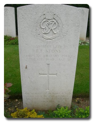 | Notes: | CMP. 5 L of C pro Coy. Enlisted in the Bedford & Hertfordshire Regiment, transferred to CMP. Casualty List 283/26, BEF, France, missing, 10/5 to 16/6/1940. Casualty List 757/1, BEF, France, Died, 27/5/40, previously on List 283 as missing, 1/5 - 16/6/40. Casualty List 839/10, BEF, France, List 757, Died, 27/5/1940, previously shown on List 283 as missing 10/5 - 16/6/1940 should read on or since 27/5/940. 79/49 He was awarded the 1939 - 1945 Star, War Medal. Address:- 37 Carlton Crescent, Cheam, Surrey. He was born and resided in London. Inscription on gravestone: In memory of so noble a man, will live in the hearts of those who love him for ever. Frederick Edward Stone. |