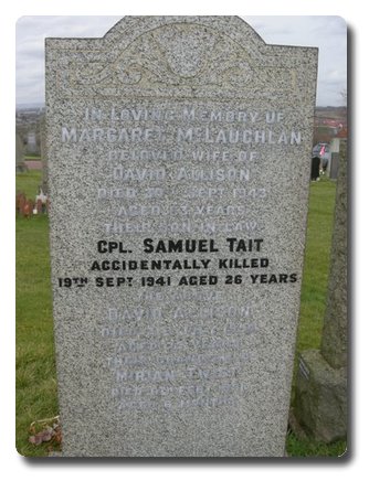 | Notes: | CMP. 17/8/39 enlisted in the 6 Lancashire Fusiliers, 25/1/41 transferred to CMP. 69 Coy TC. 19/9/41 Died. He was born and resided in Manchester. War Diary 69 Company TC, WO 166/5884. 19/9/41 Cpl Tait killed in motorcycle accident. 22/9/41 17.30 hrs, inquest on Cpl Tate. 23/9/41 Court of Enquiry held concerning fatal accident to 3451257 Cpl Tait S. Casualty List 629/10, Home, Died Result of Accident, 19/9/1941 rank Cpl. Casualty List 634/11, Home, Died Result of Accident, A/Cpl, rank should read Cpl. 20/9/49 He was awarded the Defence Medal, War Medal. Address:- 36 Mill Road, Cambuislang, Glasgow, Scotland. Inscription on private gravestone: In loving memory of Margaret McLauglan beloved wife of David Allison, died 30 Sept 1943, age 63 years. Their son in law Cpl Samuel Tait, accidentally killed 19th Sept 1941, age 26. Samuel Tait. |