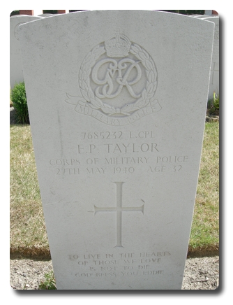| Notes: | CMP. He was born and resided in Cardiff, enlisted in to CMP. Casualty List 240/5, BEF France, 27/5/40, Killed in Action. Medal card not found. Inscription on gravestone:- To live in the hearts of those we love is not to die. God bless you Eddie. Edmund Phillip Eddie Taylor. |