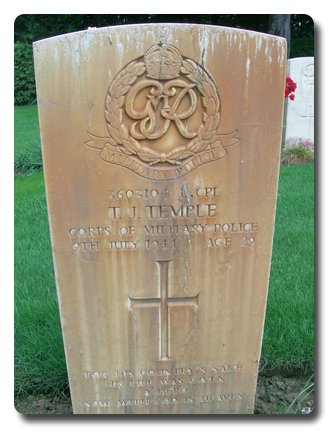 | Notes: | CMP. He was born and resided in Newcastle upon Tyne and formerly served in the Border Regiment. R Beach Pro Coy War Diary WO 170/3585. Fatal accident, one other rank, caused by mine. This other rank deviated from tape and walked across country. Casualty List 1514/7, Italy, Missing, 9/7/1944. Casualty List 1867/2, Italy, previously reported missing now presumed killed in action, previous List 1514 , 9/7/1944. Casualty List 1899/14, corrections, Italy, previous Lists 1867 & 1514, previously reported Missing presumed killed in Action, 9/7/1944, casualty should read Killed in Action. Medal card not found. Inscription on gravestone: For his country's sake his life was given, a hero now with God in heaven. Thomas James Temple. |