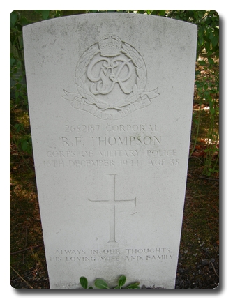 | Notes: | CMP. 10/7/1925 he enlisted in the Coldstream Guards at Hull, age 18.5 years, occupation Farm Servant, born Boynton, Bridlington, NOK Foster Mother, Middle Street, Kelham, Lowthorpe, Yorkshire, 9/7/1937 to Army Reserve, 10/5/39 re enlisted in the Coldstream Guards, later Green Howards, 25/1/41 transferred to CMP. 185 Coy Ports. 16/12/44 Died. He was born in Yorkshire and resided in Middlesborough. Inscription on gravestone: Always in our thoughts, his loving Wife and Family. Unit War Diary, 185 Port Coy, CMP WO 171/7825. 16/12/44 He was killed when the Company HQ was hit by a V2 rocket killing RSM Southon, L/Cpl's Acford, Duke, Hawkins, Nisbet, Toyne, Thompson and Yates. 22/5/45 Relatives of the dead received £11 each, collected by the Company. Casualty List 1645/19, Western Europe, Died of Wounds, 16/12/1944, CL 1652/19. Casualty List 1652/19, corrections, Western Europe, Died of Wounds, should read Killed in Action, 16/12/1944, CL1649/19. Casualty List 1664/14, corrections, Western Europe, previous List 1645 corrected by 1652, Killed in Action, Rank W/Cpl. 7/9/49 He was awarded the 1939-1945 Star, France & Germany Star, Defence Medal, War Medal. Address:- 28 Aire Street, South Bank, Middlesbrough, Yorks. Reginald Fennell Thompson. |