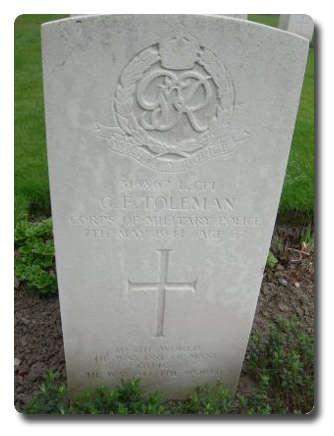 | Notes: | CMP, TC. 12/6/30 enlisted in the Cavalry of the Line, Lancers, regular army for 6/6/years, born 2/4/1914 in London. 25/1/41 transferred to CMP. 7/5/41 Died. He was born in Dorset and resided in London. He is shown as Royal Armoured Corps in Soldiers died. Inscription on gravestone: To the world he was one of many, to us he was all the world. Casualty List 279/5, BEF France, Missing, attached to Aux Military Pioneer Corps, date not reported. Casualty List 365/1, previously reported missing now not missing, attached AMPC List 279. Casualty List 554/10, CMP. Home, Died as a result of an accident, 7/5/1941. Medal card not found. George Edward Toleman. |