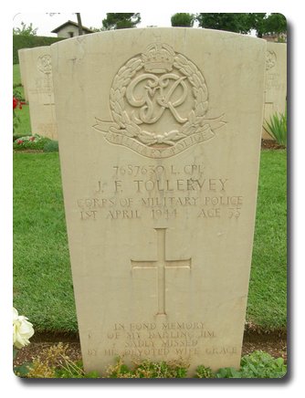 | Notes: | CMP. He was born in Suffolk and resided in Middlesex and enlisted in to CMP. 4 Div Pro Coy. 4 Div Pro Coy War Diary WO 170/424. Aqua Fondata, 1 CMP L/Cpl Killed (Tollervey) 2 (3) wounded during enemy shelling (305117 L/Cpl Gentle, 2653458 L/Cpl, Morgan, 7691824 L/Cpl Silvester) Casualty List 1423/9, Italy, Killed in Action, 1/4/1944. 26/7/48 He was awarded the 1939-1945 Star, Africa Star, Italy Star, Defence Medal, War Medal. Address:- not shown. Inscription on gravestone: In fond memory of my darling husband Jim, sadly missed by his devoted wire Grace. James Frank Tollervey. |