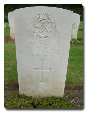 | Notes: | CMP. 241 (Beach) Pro Coy. He was born in Lancashire and resided in Manchester and enlisted in CMP. Unit War Diary WO 171/3386. D Day. Beach Cpl's landed H + 20. 07.30 hrs OC Lt Beard and beach section landed H + 4%. Lt Jones and dump section landed H + 120. All sections landed H + 5 hours. Heavy mortar fire. Cpl Tweedale, L/Cpl's Hilliard Killed in action, L/Cpl's Blake, Dewhurst, Murdoch, Cook, Lawson & Squire wounded on D Day Evacuated to UK. No inscription on gravestone. Casualty List 1488/15, North West Europe 1488, Killed in Action, 9/6/1944, No. given as 4690491. 6/9/49 He was awarded the 1939-1945 Star, France & Germany Star, Defence Medal, War Medal. Address:- Mrs. E Tweedale, 6 St Mary's Terrace, Rawtenstall, Rossendale, Manchester, Lancs. William Tweedale. |