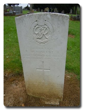 | Notes: | CMP. Enlisted in to CMP. He was born in Northamptonshire and resided in Northampton. 30/1/1944 died as a result of an accident. Inscription on gravestone: In loving memory of my Bill who just clung to the cross and exchanged it that day for a crown. A plate set in the grave reads: Treasured memories of Olive Mable Vincent, Loving wife of William Vincent 1907-1998, Re-United. Casualty List 1363/20, Home, Died result of accident, 30/1/44. 5/9/49 He was awarded the Defence Medal, War Medal. Address:- Mrs D M Vincent, 15 KingsleyRroad, Rothwell, Nr, Kettering, Northants. William Vincent. |