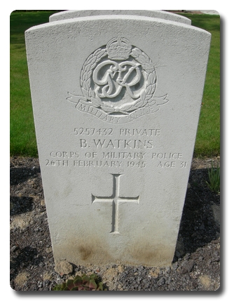 | Notes: | CMP. Enlisted in the Worcestershire Regiment, transferred to CMP. He was born and resided in Birmingham. Unit War Diary 24 TC Company WO 171/7787: 1 Other ranks killed (Pte. Watkins) as a result of accidental firing of a Sten Gun. Casualty List 1711/15, Western Europe, Died Result of Accident, 26/2/1945. 28/2/50 He was awarded the 1939 - 1945 Star, France & Germany Star, Defence Medal, War Medal. Address:- Mrs I G Watkins, 150 St. Vincent Street, Ladywood, Birmingham 16. Warwickshire No inscription on gravestone. Bernard Watkins. |