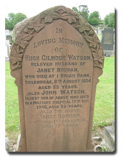 | Notes: | CMP. Enlisted in the Royal Scots, transferred to CMP. 17/0/40 Died. He was born and resided in Dumfries. Inscription on private gravestone: John Watson, eldest son of above who died in a Military Hospital, 17th Sept. 1940, age 35. Casualty List 330. Home, Died, 17/9/40. Medal card not found. John James Watson. |