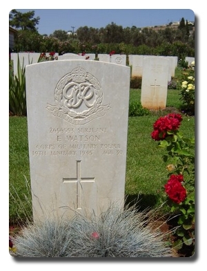 | Notes: | CMP. Enlisted in the Coldstream Guards, 23/2/40 compulsory transfer to CMP. 1941 Sgt. 65 Coy TC. 19/01/45 Died. He was born and resided in Durham City. Casualty List 1673/3, Italy, Killed in Action, 19/1/1945. GSM Palestine. Medal card not found. No inscription on gravestone. Ernest Watson. |