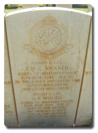 | Notes: | CMP.   He was born and resided in London N and formerly served in the Gloucestershire Regiment.   1 Div Pro Coy War Diary WO 175/134.  16/6/43 Killed in a bombing raid on the Island of Panterlleria with L/Cpl's Vanner, Griffin and Higson, operation Corkscrew.   Inscription on gravestone: Deep in our hearts his memory is kept, one of the dearest, one of the best.    Casualty Lists 1180/4, North Africa, Killed in Action, 16/6/1943. Medal card not found. He is buried in a joint grave with L/Cpl Vanner. George Francis Woods.  |