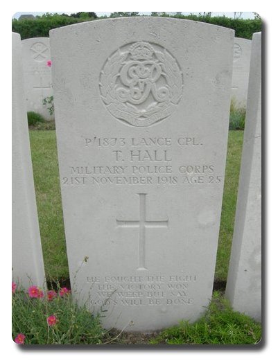 | Notes: | MFP. Awarded the 1915 Star, Victory and War Medals. 21/11/1918 Died. First Served abroad (1) France, 11/10/15. He was born in Blackpool and enlisted and resided in Burnley. Died 21/11/18. Inscription on gravestone: He fought the fight, the victory won we weep but say God's will is done. Information for Service Record: Enlisted age 21 years, occupation Police Constable, Home Address: 115 Coal Clough Lane, Burnley. He enlisted 8/7/15. Died from pneumonia whilst serving with the BEF. The following effects were returned to his Widow Mrs A Hall, 3 Dale Avenue, Bispham, Blackpool: Letters, Photos, large wallet, 2 safety razors in cases, cap badge, small photo in tin, comb, knife fork spoon combination, pr scissors, 2 pencils, gold ring (9 ct), post card, wrist watch & strap & guard, steel mirror, pocket wallet, AB 50. 10/11/15 Amiens, 9/10/16 Albert, 11/9/17 Proyart. Served Home 8/7/1915 to 10/10/1915, BEF 11/10/1915 to 21/11/1918. Info from Pension Index Cards:- Hall, Ada, 99, 3 Dale Avenue, Bispham, Blackpool, P/1873, L/Cpl Thomas Hall, MFP. Also:- Hall, Thomas, P/1873, case no.99, MFP, L/Cpl, form received 12/12/1918, death notification 28/11/1918, form 104-76 received 16/1/1919, date & cause of death 21/11/1918 pneumonia whilst on active service, widow Ada, 3 Dale Avenue, Bispham, Blackpool, DEAD 1934, MK6439, £5 grand paid 20/12/1918, 507. 5/5/1919, child: May Agnes Hall born 15/10/1918, expiry date 15/10/1934, pension 20/5 from 26/6/1919, awarded 10/6/1919. Also:- 3/APW/2955. widow Hall, Ada, husband, Hall Thomas, MFP, No. 1873, Cpl, widow born 3/11/1893, children 1, 15/4/1928, OK. Thomas Hall. Extract from the Burnley News 12 November 1921, THE FORCES PROUND RECORD; The highest honour, the noble sacrifice of their lives, was reserved for those whose names were inscribed upon the memorial. "It was the example of those lives which made their memory precious to the land they loved." "They have put on immortality and being dead they live." Their names were: (8 Names). PO.C. 59 Thomas Hall (Military Foot Police). Army Registers of Soldiers' Effects: 21/11/1918 died of illness, France, 9/8/1919 widow Ada received £0-09-05 and 19/12/1919 received £ 0-18-06 see also 502/823311 £13-10-00. Info from Pension Index Card: Hall, Thomas, MFP, No. P/1873, Cpl. His wife and 1 child received a weekly pension of 20/5, Widow Ada Hall, born 3/11/1893, 36 Ferguson Street, Marton, Blackpool. Thomas Hall. He is shown on a photograph in the Police Review dated 1916 MILITARY FOOT POLICE "SOMEWHERE IN FRANCE." Also shown L/Cpl Hollinrake P/1874 and L/Cpl Milligan P/1875 of the Burnley Borough Police. L/Cpl, Hall, Burnley |