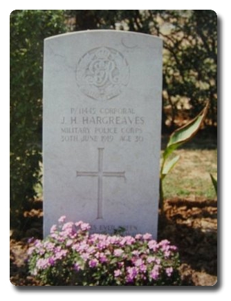 | Notes: | MFP. Awarded the Victory and War Medals. First served abroad (4) Mesopotamia, 7/6/1916. Formerly served in the 6 Loyal North Lancashire Regt. No. 23151. He was born , enlisted and resided in Chorley. Inscription on gravestone: Memories ever green, from his devoted wife Martha. 10/12/1915 he enlisted in the North Lancashire Regiment No. 23167, 17/2/1916 mobilized, age 26 years, occupation fish merchant, address: 4 Pall Mall, Chorley, Lancashire. 7/6/1916 transferred to MFP. 10/12/1915 served Home, 9/6/1916 to Mesopotamia, 10/7/1918 invalided to India, 30/6/1919 died Delhi, India. 19/1/1916 he married Martha Toothill, spinster at Parish Church, Chorley, address: 27 Anderton Street, Chorley, the had 1 x daughter Jennie born 5/8/1916. 19/1/1920 widow received 23/- per week pension. Info from Army Register of Soldiers Effects 1901-1929. 306/1919 died Delhi, India. Info from Pension Index Card:- Hargreaves, James Holt, No. P/11445, MFP, L/Cpl. Widow Martha, 74 Anderton Street, Chorley, Lancashire. 23/7/1919 she received a £5 grant. James Holt Hargreaves. |
