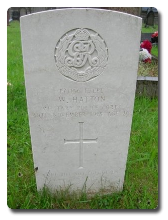 | Notes: | MFP. Awarded the 1915 Star, Victory and War Medals. First served abroad (1) France, 4/2/1915 to 7/6/15. Formerly Pte. 1/5 Cheshire Regiment. No. 1512. He was born and enlisted in Winsford and resided in West Felton. Inscription on gravestone "Gone but not forgotten. Info from 2 x Army Register of Soldiers Effects 1901-1929. Died, Royal Infirmary Dumfries. 18/9/1919 widow Annie received £10-07-11, 4/10/1919 GSB received £20-03-00 note son William C born 17/3/1919 12/6d at ? and 18/8/1919 widow Annie received £10-07-11 and GSB £23-03-00 including £25 war gratuity and son William. Info from pension card index:- Hatton, William, No. P/7156, L/Cpl, MFP, 30/11/1918 Died, widow Annie C/O Mrs Corbett, Yew Tree House, West Felton and c/o Llanyfelling House , Sodylt, Ellesmere, child William Cecil born 17/3/1919, date of expiry 17/3/1935. 3/1/1919 received £5 grant, 16/6/1919 received a pension of 20/5 per week. William Hatton. |