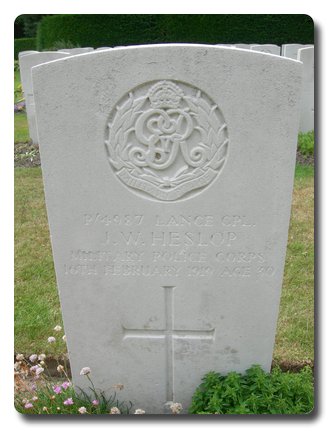 | Notes: | MFP. Awarded the 1914 Star, Victory and War Medals. First served abroad (1) France, 13/8/1914 to 2/11/1914 and 28/3/1915. Formerly Pte. 1 Coldstream Guards. No. 8602. No inscription on gravestone. He was born and resided in Bishop Aukland and enlisted in Darlington. 1/10/1916 to MFP. Info from Army Register of Soldiers Effects 1901-1929. Died. from influenza. 16/8/1919 mother Sarah received £29-00-07, 23/8/1919 RP Woking £1-03-00, 30/9/1919 Sarah 6/8d including £26-10-00 war gratuity. Info from Pension Index Cards: Heslop. John William No. P/4987, MFP, A/L/Cpl. 16/2/1919 died from influenza. Dependant Mrs Sarah Heslop, 30 Grasmere Street, West Hartlepool, mother changed to John William Heslop, 170 York Road, West Hartlepool. father. 29/9/1919 he received 8/- peer week pension. John William Heslop. |