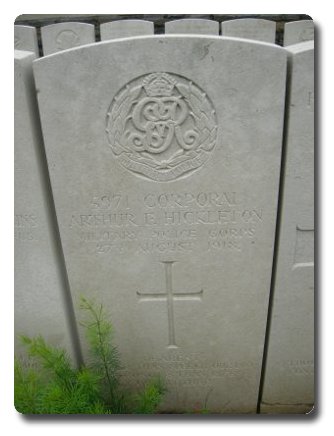 | Notes: | MMP. Awarded the Victory and War Medals. First served abroad (1) France, 10/1/17 to 17/8/18. Previously served 4 years in the 4 Northumberland Fusiliers, 14/1/15 he re enlisted in the Northumberland Hussars No. 1510, age 22 years, occupation plater address: 53 Evelyn Terrace, Wallsend Inscription on gravestone: Deeper than speech our love stronger than life our tether. He was born in Heaton, enlisted in Newcastle upon Tyne and resided in Hare Hills. Casualties, C1670, 31/8/1918. Wounded 25/8/1918, DPM 3 Army, 26/8/1918. 27/8/1918 Died of Wounds. 26/11/18 his widow Mrs, M Hickleton, 22 Ireton Street, Scarborough received the following property, Photos, cards, knife, cigarette case, metal mirror in case, scissors in case, gold ring 9 ct, diary, nail clippers, pocket photo holder, wallet, fancy pencil, metal numeral. Info from Army Register of Soldiers' Effects, 1901-1929. 669675. e618438/1. Hickleton, Arthur, MMP, L/Cpl, P/5971, 27/8/18 died of wounds in 3 Canadian Casualty Clearing Station. 26/11/18 his widow Mary received £2-03-04, then 3/12/19 £17 war gratuity. Info from Pension Index Cards:- 66. Hickleton, Mary Ellen, 8 Roundhay Road, Hare Hills, Leeds, P/5971, L/Cpl, Arthur Hickleton, MMP. Also:- DEPENDANT'S PENSION. MPW3. WFS.32, DFS.46. 66, DP13. Hickleton, Arthur Frederick, P/5971, MMP, L/Cpl, 27/8/18 DIED of wounds, Widow, Mary Ellen, DEAD 13/2/29, 2. Mrs E Peacock. Also:- DP13. Peacock, Mrs. E. (guardian) 34 Cumberland Street, Wallsend, Staffs, P/5971, Pte. Arthur F Hickleton, MMP. He was buried on the same day as Cpl, T Dillon, MMP, P/7174 at Lingy sur Canche. Arthur Fredeick Hickleton. |