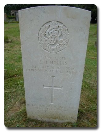 | Notes: | MFP. He was born in Witney, enlisted and resided in Trowbridge. Died. Formerly Pte Devonshire Regt. No. 27873. Inscription on gravestone: He lives in our memories still, peace perfect peace. Info from Army Register of Soldiers Effects 1901-1929. 6/11/1918 Died, Military Hospital, Chiseldon Camp, Wiltshire. 6/2/1919 widow Rose received £6-04-02 and 6/12/1919 £6-05-00 war gratuity. Info from Pension Index Cards: Hollis, Edward Joseph, No. P/8999, MFP, L/Cpl, 6/11/1918 died from influenza and bronco pneumonia, Widow Rose Annie, born 13/2/1886, Watercress Cottage, Farleigh, Hungerford, they had 3 x children, Elsie May, born 26/4/1907, Margaret Lilian born 6/11/1908 and Bessie Edith born 24/7/1911. 4/12/1918 she received £8 grant, 12/5/1919 she received 29/7 per week. Card marked "payable in Canada". 2 x Card Morgan, Rose Annie, Canada, re married widow of Hollis, Edward Joseph, MFP, P/8999, copied from P10 OS index 23/11/1917. Edward Joseph Hollis. |
