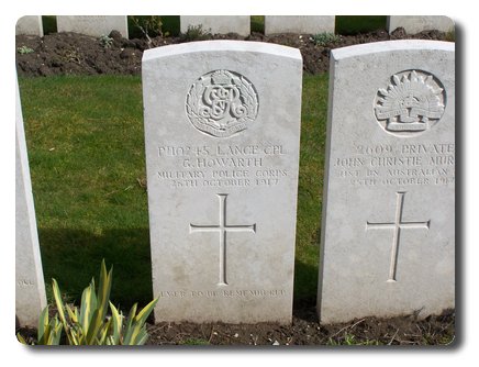 | Notes: | MFP. Awarded the 1915 Star Victory and War Medals. Formerly Pte. 1 Lancashire Fusiliers. No. 12276. First served abroad (2a) Balkans, 26/10/1915 to 17/2/1916 and (1) France, 6/5/1917 to 26/10/1917. He was born and resided in Burnley and enlisted in Nelson. Died. Inscription on gravestone: Ever to be remembered. Widow Mary Martha Howarth. Greater Burnley's Roll of Honour, page 61: Howarth, G, 10245, MFP, hear failure, Oct. 26, 1917, France, 38, Ardwick. Info from Army Register of Soldiers Effects 1901-1929. 26/10/1917 died Etaples, France, 4/3/1918 his widow Mary received £6-12-11 and on 17/2/1919 she received £14 war gratuity. Info from Pension Index Card: Howarth, George, MFP, No. P/10245, L/Cpl. Widow Mary Martha Howarth. No other details. Also:- Howarth, Mary Martha, 39890/OS/W, 13 Wood Street, Burnley, Lancs, P/10245, L/Cpl, Geo Howarth, MFP. Also:- SB.36-W. WIDOWS. 2/W/90. Widow: Howarth, Mary Martha, husband, Howarth, George, MFP, P/10245, L/Cpl. Also:- W1. 39890/05/W. NA.2877. Howarth, Geo, P/10245, MFP, L/Cpl, 26/10/17 DIED from heart failure, widow, Mary Martha, 13 Wood Street, Burnley, c/o Hartley, 202 Victoria Avenue, Niagra Falls, Ontario, Canada, born 9/5/89, 3/12/17 she received £5 grant, children: Maggie Hartley, born 17/6/08, Phyllis Howarth, born 6/4/10, 3/6/18 she received a pension of 25/5 per week. George Howarth. Extract from the Burnley Express 9 August 1919. DISEASE OR ACCIDENT. The following NCO's and men died from illness or accident whilst on active service abroad or at Home: Burnley, Howarth, G 10245, L/Cpl, Military Foot Police, heart failure, Oct 26, 1917, France, 38 Ardwick Street. |