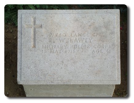 | Notes: | MMP. Awarded the 1915 Star. First served abroad (2a) Balkans, should read (2b) Gallipoli, 16/3/1915. Killed in Action. He was born in Hunmanby, enlisted and resided in East Ham. Info from Pension Index Cards: MPAP.54. 11/APW/3854. Lawty, Fanny (W), 17 Michigan Avenue, Manor Park, East Ham, London, MMP, L/Cpl, P/760. Also:-11/ARW/3854. Lawty, William, P/760, MMP, L/Cpl, 13/5/15 killed in action, Widow, Fanny, born 8/12/71, children George William John, born 5/5/01, 3/1/16 widow awarded 17/6 per week pension. William Lawty. |