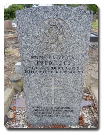 | Notes: | MFP. He was born in Oldham and enlisted in Oldham and resided in Oldham. Died, He formerly served in the Manchester regiment No. 4796. Inscription on gravestone:- Cherished memories of my husband, often recalled with a silent tear. Info from Pension Index Cards:- 3/ML/8377. Lees, Fred, MFP, P/7775, L/Cpl, Widows Section Regional, 3/4/22, OK 15/10/25. Also:-Lees, Mrs Margaret, 1 Shaw Street, Warrington, P/7775, A/L/Cpl, MFP, Fred Lees. Also:- 3/W/2982. Widow: Lees, Mrs, husband Lees, Fred, MFP, P/7775, L/Cpl. 15/9/22. Also:- Lees, Fred, MFP, L/Cpl, P/7775, Manchester Regt, 25/9/19 to discharge, SFJ.4159, 3/ML/8377, 6 Aberdeen Grove, Stockport. Stamp: Ad 15/10/19 at 12/- from 26/89/19 to -, Chelsea no. Z/Misc,2975, received 16/10/19. Also:- Lees (Mrs. M Atherton, 1 Shaw Street, Warrington) Case No. 162, P/7775, L/Cpl, Frederick Lees, MFP. Frederick Lees. |