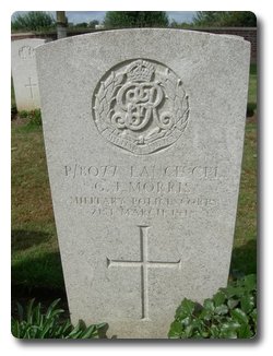| Notes: | MMP. Awarded the Victory and War Medals. First served abroad (1) France, 26/2/17 to 21/3/18, 2/4/17 on medal roll. He was born in Trimpley, enlisted and resided in Kidderminster. Died of wounds, 3 Casualty Clearing Station, Army Register of Soldiers' Effects, 1901-1929. Died on the same day as L/Cpl Shickle of same unit. No inscription on gravestone. Info from Pension Index and Widow's Pension Cards: Morris, George James, P/8077, Military Mounted Police, L/Cpl. Widow Hilda, 55 Cherry Orchard, Kiddiminster. 6/5/1918 she received a grant of £5 Kidderminster. Info from Pension Index Card; Morris, Hilda, 55 Cherry Orchard, Kidderminster, 58, P/8077, L/Cpl, George James Morris, MMP. Info from the Police Review, 12/4/1918, page 116: Official information came to hand last week announcing that PC George James Morris had died from wounds in France. It appears that he was on Mounted Police duty on the Messines-Ypres road on March 21st, and must have seen something of the great battle which is still in progress. He joined the force at the special request of the authorities, being a Constable of eight years experience and used to directing and controlling of traffic. He leaves a widow with two young children. |