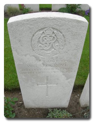| Notes: | MFP. Awarded the Victory and War Medals. First served abroad (1) France, 16/4/1917. He was born in Gatton, Surrey, enlisted in Caterham and resided in Warlingham. Died. Inscription on gravestone: In the midst of life we are in death. He resided in 1 Glebe Cottage, Elm Road, Upper Warlingham, Surrey. Enlisted 29/11/1915, Army Reserve 30/11/1915 to 13/6/1916, Home 14/6/1916 to 15/4/1917, BEF 16/4/1917 to 3/12/1918. Died at 35 General hospital, Calais from influenza, pneumonia. He arrived Boulogne 17/4/1917 to 5 GB Depot, Rouen, To APM Calais 19/5/1917. The following items were returned to his wife, Letters, Photo's, Pipe, Cigarette Case, Knife, Tobacco Pouch, Cap Badges, Ring, Pen. His wife and 5 children received a weekly pension of 37 shillings and 11 pence. Army Register of Soldiers' Effects, 1901-1929. 14/4/1919 his widow Helen received £19-08-03, including £17-10-00 war gratuity. Info from 2 x Pension Index Cards: P/3228, L/Cpl. William, 3/12/1918 died Slogrove, MFP, wife Slogrove, Ellen Bertha, born 9/8/1878, 1 Glebe Cottages, Elm Road, Warlingham, Surrey, they had 5 children: Herbert born 29/8/1905, Dorothy 31/3/1906, Leslie 7/7/1907, William born 19/8/1909 and Daisy born 29/9/1912. 30/12/1918 the mother received a grant of £10 and on 9/6/1919 a pension of 57/11 per week. William Slogrove. Extract from the Dorking & Leatherhead Advertiser, 21/12/1918. (small photo) L/Cpl W Slogrove, Warlingham. As briefly announced last week L/Cpl W J Slogrove of the Military Foot Police and whose home at Glebe Cottage, Elm Road, Warlington, died from pneumonia in hospital in France on Tuesday December 3rd. He was buried in Les Barques Cemetery. He was 41 years of age and leaves a widow and five children, who have the deepest sympathy of the inhabitants of the village. The deceased joined up under the "Derby" scheme in the early days of the war, and has seen a good deal of service. (article shown photograph of L/Cpl Slogrove in uniform.) |