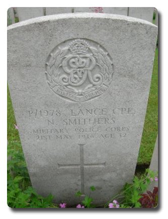 | Notes: | MFP. Awarded the 1915 Star, Victory and War Medals. First served abroad (1) France, 18/11/1915 to 21/5/1916. Died of Wounds 21/5/16. He was born in Pyrford, enlisted and resided in Guildford. Family lived on the Green, Pyrford, Nr Woking, Surrey. Inscription on gravestone: Gone but not forgotten. Served in the Surrey Constabulary No. 1456. Info from Army Register of Soldiers' Effects, 1901-1929. Smithers, Noah, MFP, L/Cpl, P/1978, died 21/5/1916, France & Belgium. 12/7/1916 Mother Emily, sole Leg was awarded £8-16-7, 22/8/1919 awarded £3 war gratuity. Info from Pension Card Index: Dependant's Pension. Smithers Noah, No. P/1978, MFP, L/Cpl, 21/5/1916 died of wounds. Dependant Mrs Emily Smithers, mother, Green Side, Ripley later 25 Glenese Road, Weybridge, Surrey. 28/11/2916 awarded pension of 5/- per week. She is shown on Claimant Card as deceased 20/3/1924. Noah Smithers. Extract from the Derby Daily Telegraph, 9/6/1916, Local Casualties. Died of Wounds, Military Foot Police, Smithers, P/1978, L/Cpl N (Ripley). (He was from Ripley, Surrey not Ripley, Derbyshire). |