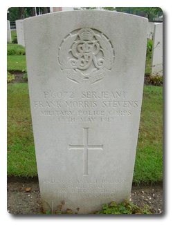 | Notes: | MFP. Awarded the 1914 Star, Victory and War Medals. First served abroad (1) France 9/9/1914 to 15/5/1917. Formerly Cpl. 1 Leicestershire Regiment. No. 1/6479. He was born, enlisted and resided in Chelmsford. Died. Inscription on gravestone: And son's as yet unborn shall read how Britain's died for Britain's need. Frank Morris Stevens. Extract from the Chelmsford Chronicle, 18/5/17. Sergeant. F M Stevens Acting Sergeant Major, Military Foot Police who died from quinsy in Le Havre Military Hospital was the eldest son of Mr and Mrs J Stevens, 35 Rainsford road, Chelmsford, who have tow other sons serving, one being wounded. The late Sergeant Stevens leaves a widow and one daughter. He was formerly employed in the hardening shop at Hoffmann's. |