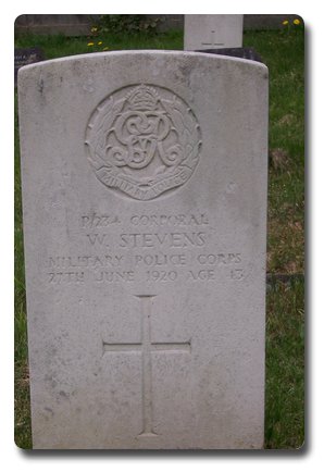 | Notes: | MFP. Served Home. 27/6/1920 Died. Enlisted in MFP 6/10/14 age 37.6 years, occupation Postman, home address: 5 Sunny Deane Villas, Kenley, Surrey and later Oak Cottage, Kenley, Surrey. Born St Peters, Brighton, Surrey. Not listed in Soldiers Died. Inscription on gravestone: Dearly loved and sadly missed. 24/2/19 to class Z reserve. Formerly served 12 years in the Kings Shropshire Light Infantry, No. 3779, age 15 years, occupation Musician. Served Home 6/10/92 to 6/11/99, South Africa 7/11/99 to 11/6/00, Home 12/6/00 to 8/1/02, South Africa 9/1/02 to 7/1/03, India 8/1/03 to 6/1/05, Home 7/1/05 to 21/1/05 to discharge. Info from pension card:- SB.36/W. 11/W/6396. Bailey William, Widow Bessie Bailey Stevens, born 20/6/81, 3 children, 8 Oak Cottages, Goldstone Road, Kenley, Surrey. 30/6/21 received pension of 26/8 + 23/6 child allowance, total 50/2 per week. Also:- Stevens, William, MFP, A/Cpl, P/234, 24/2/19 to discharge, DIED 20/6/20, SFJ.4972, 11/M/246973, 2556/F, File destroyed 4/10/27. Stamp: Ad 13/4/20 at 12/- from 3/2/20 to 21/9/20, Chelsea no. X/MFP/356, received 15/4/20. William Stevens. |