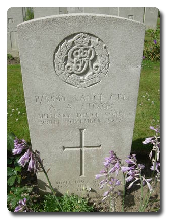| Notes: | MFP. Awarded the Victory and War Medals. First served abroad (1) France, 13/3/1917 to 29/11/1917. He was born in Powick, enlisted in Worcester and resided in Halesowen. Killed in action. Inscription on gravestone: God loved him and so did we love, his wife Lill. He enlisted age 24 years and resided at the Police Station, New Road, Halesowen. Formerly a Civil Policeman . Served Home 28/12/1916 to 19/3/1917, BEF 13/3/1917 to 29/11/1917. 29/11/1917 killed in action whilst serving with the Expeditionary Force, France. Casualty List C/1412 dated 16/12/1917, Military Foot Police. P/5836. L/Cpl Stokes A K. KIA 29/11/1917, Reported by OC No1 Traffic Control Company, 1/12/1917. Info from Army Register of Soldiers' Effects, 1901-1929. 6/3/1918 he left his widow Lilly £1-12-10 11/11/1919 a further £3 war gratuity. Arthur Alfred Stokes. Roll of Honour, Killed in Action. Worcestershire. - Pte Stokes, Military Mounted Police, Foot Police). Police Review, 17/5/1918, page 156. |