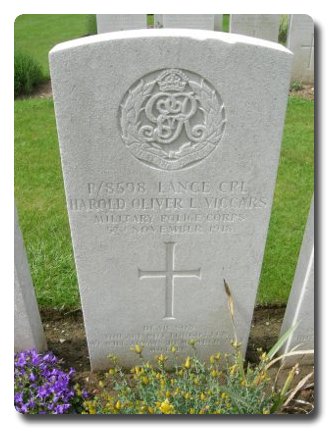 | Notes: | MFP. Awarded the Victory and War Medals. First served abroad (1) France, 16/4/1917. He was born in Newton Regnall, enlisted and resided in London. Died. Inscription on gravestone: Dear son you are not forgotten, we will always remember you. Mother. Medals claimed by his mother Mrs Sarah Viccars, 23 St Michael Street, Folkstone. Harold Oliver Lee Viccars. Army Registers of Soldiers' Effects: 5/11/1915 died from illness, 2/8/1919 father Alfred received £00-4-00, 6/3/1919 received £2-06-04, 7/12/1919 received £7-00-11. Harold Oliver Leo Viccars. Extract from the North Bucks Times and County Observer 19 November 1918. LITTLE BRICKHILL. DIED IN FRANCE - The death took place in France on November 5th from pneumonia following influenza of Detective Harold Viccars, of the Military Foot Police. He was very well known and had many friends in the village. he joined the London Constabulary in which he was doing well when called out to the front and there he served with the Military Foot Police as a detective. His many friends will deeply deplore his death almost at the time peace was about to be declared. He was the son of PC Viccars, lately of Little Brickhill. |