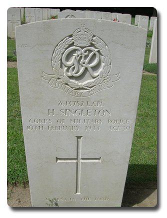 | Notes: | CMP. He was born and resided in Wigan and formerly served in the Grenadier Guards. 505 Ind Mobile Pro Unit War Diary WO 170/3548. 2613752 L/Cpl Singleton CMP (P) 65 General Hospital. Entry on AFW 3009E, 12/2/1944, Field Return of other ranks. No mention of death in War Diary. Inscription on gravestone: O Rest in the Lord. Casualty List 1377/24, Italy, Died 10/2/44. 25/1/49 He was awarded the 19139-1945 Star, Africa Star, Italy Star, Defence Medal, War Medal Harry Singleton. |