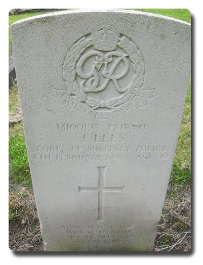 | Notes: | CMP. He was born in Bury and resided in Lancashire and formerly served in the Pioneer Corps. Inscription on gravestone: your star of hope will be my guide, till we meet you at eventide. James Lees. |