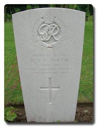 | Notes: | RMP. 112 Pro Coy. 2/1/47 Died in an accident. No inscription on gravestone. Bruce Ernest Crosbie Smith. Extract from the Liverpool Echo, 24/1/47. Killed in Italy Crash. News has been received by Mr and Mrs J E Smith of Wheatridge, Burton, Wirral formerly of Wallasey, of the death in the Twenty Second General Hospital, at Padua, Italy of their only son, Lance Corporal Bruce Smith, 112th Provost Coy, Corps of Royal Military Police, CMF in his twentieth year. He was taken to hospital suffering from head injuries as a result of his jeep colliding with a lamp standard. He joined the Army two years ago, served with the King's Own Royal Regiment for twelve months, and volunteering for the Military Police was transferred last February to the CRMP, and had been in Italy eleven months. (article has small picture of L/Cpl Smith.) |