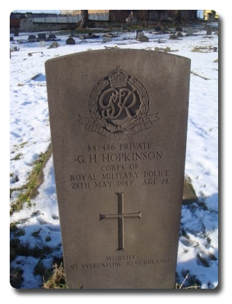 | Notes: | CMP/RMP. Enlisted Royal Artillery, transferred to CMP. 28/5/47 Died. Inscription on gravestone: Worthy of everlasting remembrance. George Hubbard Hopkinson. |