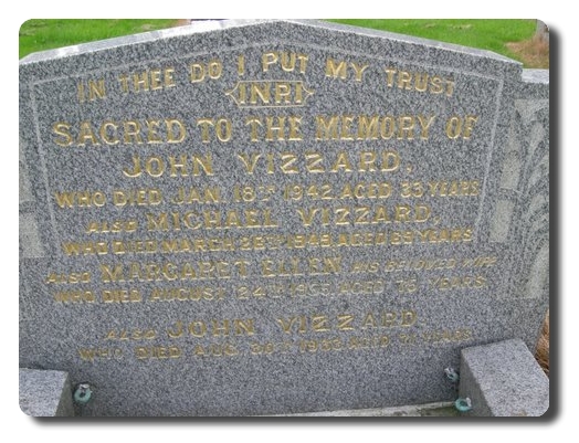 | Notes: | CMP. Enlisted in to CMP. Not listed in Crozier Roll of Honour. Inscription on gravestone: In thee do I put my trust (INRI), sacred to the memory of John Vizzard who died January 18th 1942, aged 33 years. John Vizzard. Extract from the Ramsbottom Observer - Friday 23 January 1942. IN DUNKIRK BATTLE. DEATH OF MR J VIZZARD OF HASLINGDEN. The death occurred on Sunday at a comparativly early age of 33 years in a pulmonary hospital at Withnell, of Mr John Vizzard of Pleasant Street, Haslingden. Before the outbreak of war he was one of those who saw service with the Automobile Service in the Lake District. On joining up he was a Despatch Rider. He was in the retreat from Dunkirk and has since seen service in the military police before his discharge from the army. He had been in hospital for four or five months and was the son of Mr & Mrs Vizzard. He leaves a widow who in maidenhood was Miss Amelia Nutthall of Crawshawbooth. (The article goes on to describer the funeral and mourners.). |