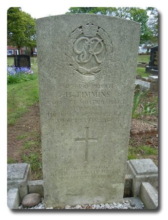 | Notes: | CMP. TC. 6/4/45 Died. Not listed in Crozier Roll or Army Roll of Honour. He formerly served in the 5th Bn King's Shropshire Light Infantry. Inscription on gravestone: From the rising to the setting of the sun we will remember. 4/3/43 Discharge. Henry Timmins. |