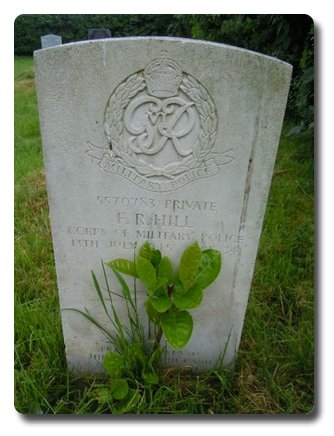 | Notes: | CMP. VP South Eastern Command. Enlisted Wiltshire Regiment, transferred to CMP. 2/3/43 discharged. 13/7/45 Died Not listed in Crozier or Army Roll of Honour. Inscription on gravestone: Francis Rowland beloved husband of Ethel May Hill, Abide with me. Casualty List not found. He was awarded the Defence Medal, War Medal. Francis Roland Hill. |