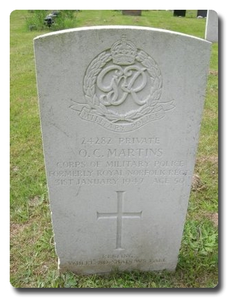 | Notes: | CMP/RMP. VP. 31/1/47 Died. Formerly Royal Army Service Corps, later Norfolk Regiment, transferred to CMP. Born 8/12/1896. Discharged 7/9/42 presumed re enlisted. Inscription on gravestone: Resting where no shadows fall. Oliver Christmas Martins. |