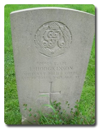 | Notes: | MFP. He is not listed in soldiers died. 8/10/1918 Died. No inscription on gravestone. Awarded the 1915 Star, Victory and War Medals. First served abroad (1) France, 25/9/1915 to 11/2/1918. Born in Draycot in the Clay, Uttoxeter, Staffs. Enlisted in the 1 Cheshire Regt. No. 2850, 30/12/1898. Served Home 30/12/1898 to 10/12/1891, India 11/12/1891 to 5/11/1897, Home 6/11/1897 to 6/1/1900, South Africa 7/1/1900 to 13/5/1900, Home 14/5/1900 to 31/3/1900. Discharged time expired 31/3/1902. Re enlisted Pte 1 Cheshire Regiment. No.11829 14/9/1914 served Home 14/9/1914 to 24/9/1915, BEF 25/9/1915 to 11/2/1918, Home 12/2/1918 to 10/6/1918 Medical discharge. Transferred to MFP 1/10/1916. Home address: 15 Waterloo Street, Burton on Trent. 18/10/18 died after discharge, Army Register of Soldiers' Effects, 1901-1929. 8/6/01 married Amy Elizabeth Allen at Hanbury Church, Burton. Israel Hodgkinson. 16/8/1920 widow Amy received £19-10-00 war gratuity. Info from Pension Index Cards:- W/25/4125. Israel Hodgkinson, No. 5919, L/Cpl, MFP. widow Amy Elizabeth born widow Amy Elizabeth Hodgkinson born 2/1/1875, children Nil. Also:- Hodgkinson, Israel, P/5919, Cheshire Regt, 11829, 10/6/18 to discharge, 11, Victoria Crescent, Horninglow, Burton on Trent. SFJ.851, Stamp: Ad 5/6/18 at 27/6 from 11/6/18 to 30/6/18, Chelsea No. VV.50.1337, received 23/6/18, Fiel Destroyed 10/1/26. Israel Hodgkinson. |