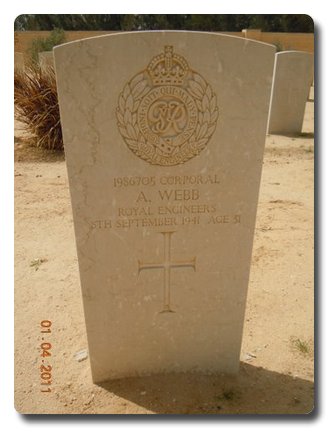 | Notes: | CMP. He was born and resided in London W and formerly served in the Royal Engineers. He is shown in CWGC as Royal Engineers. 204 Pro Coy War Diary, WO 169/2559. 7/9/1941, 20.00hrs, message received Cpl Webb, SIB injured in a motorcycle accident. L/Cpl Rowe SIB sent to investigate. 8/9/1941, 20.00 hrs received news of Cpl Webb's death at the UDF hospital, Gimrabub. 23.00 hrs L/Cpl Garuana placed in protective custody and disarmed owing to his temperamental reaction to Cpl Webb's death. 9/9/1941. 9/9/41 06.00 Sgt Caird and 3 NCO's go to collect body of Cpl Web from Gimrabub. 9/9/1941 Cpl Webb buried at Military Cemetery Matruh, grave 9, block B. Air Raid during burial service, AA fire, no bombs. 9/9/1941 signal to APM, Cairo 1986705 Cpl Webb, SIB died 21.30 hrs, 9th as a result of a motorcycle accident. Injuries compound fracture to left humerus and ruptured left kidney. No inscription on gravestone. Gravestone has badge of the Royal Engineer. Casualty List 623/2, Middle East, Died Result of Accident, attached CMP, 8/9/1941, shown on Royal Engineers List. Medal card not found. Alfred Webb. |